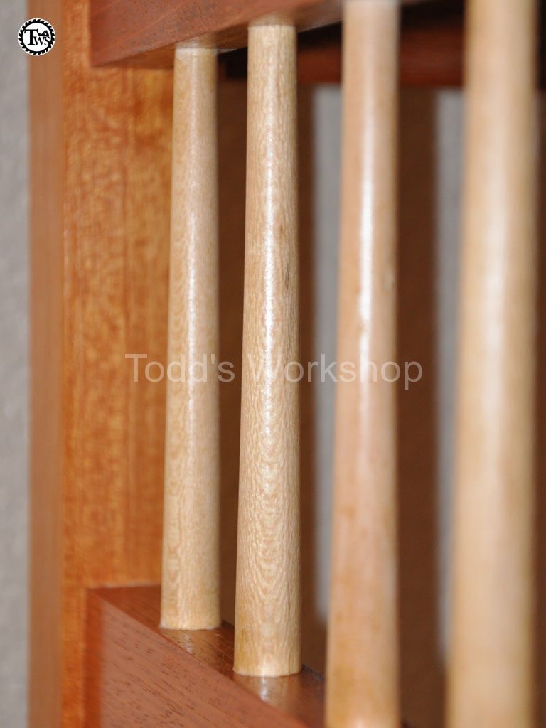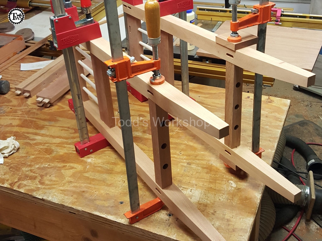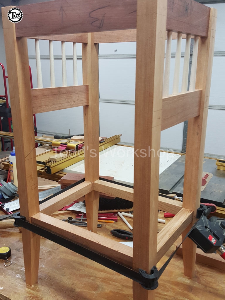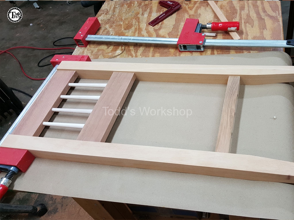 Now that all the mortises were cut I can start gluing things together. I did the glue up in two stages. I did the most mumble inducing part first, the sides with the spindles (Figure 6). Getting all the spindles lined up, before the glue set, and all the domino’s in their respective mortises careful not to dislodge a spindle was, mumble mumble, an interesting endeavor to say the least. After a bit of coaxing the sides were glued up and, to my delightful surprise, square. I’m not sure if I should have but I glued the spindles into their sockets also. I’m not sure if leaving them floating would have been best or not.